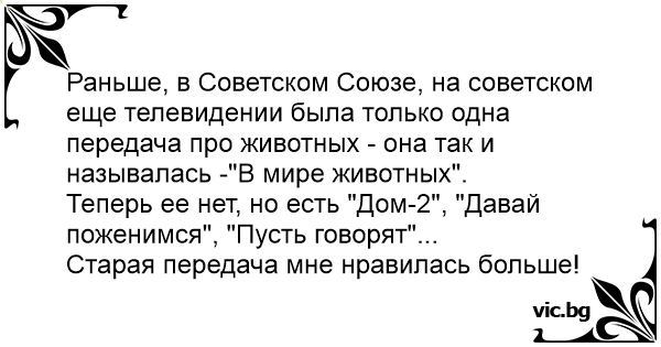 Раньше, в Советском Союзе, на советском еще телевидении была только одна передача про животных - она так и называлась -"В мире животных".