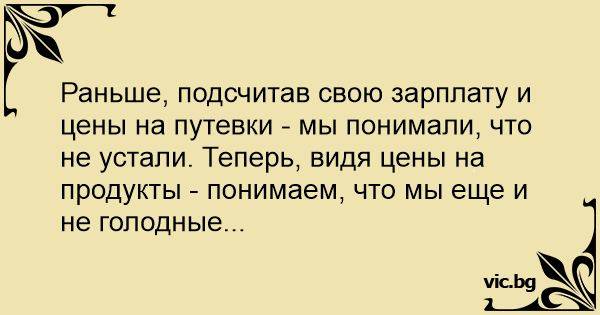 Раньше, подсчитав свою зарплату и цены на путевки - мы понимали, что не устали. Теперь, видя цены на продукты - понимаем, что мы еще и не голодные...