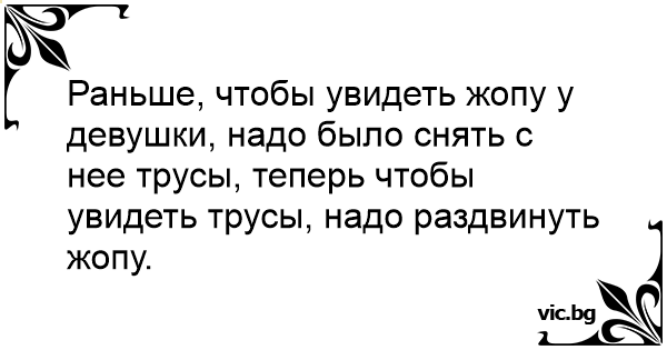 Раньше, чтобы увидеть жoпу у девушки, надо было снять с нее трусы, теперь чтобы увидеть трусы, надо раздвинуть жoпу.
