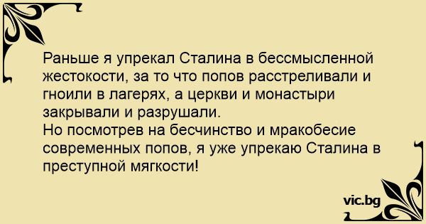 Раньше я упрекал Сталина в бессмысленной жестокости, за то что попов расстреливали и гноили в лагерях, а церкви и монастыри закрывали и разрушали. Но посмотрев на бесчинство и мракобесие современных попов, я уже упрекаю Сталина в преступной мягкости!