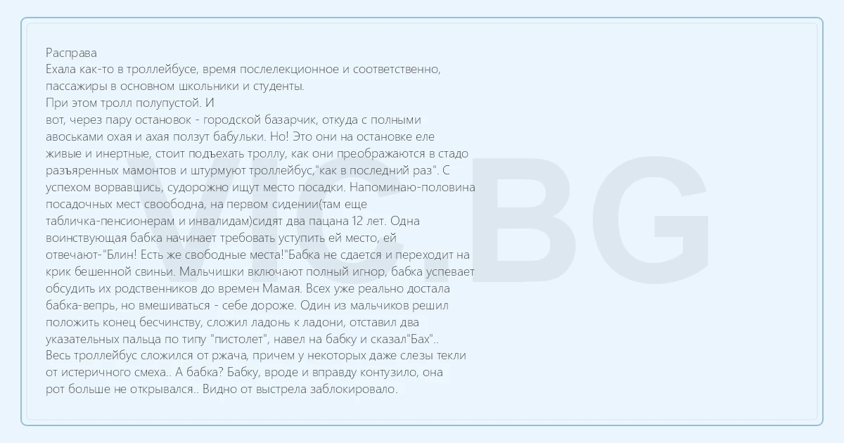 Расправа Ехала как-то в троллейбусе, время послелекционное и соответственно, пассажиры в основном школьники и студенты. При этом тролл полупустой. И вот, через пару остановок - городской базарчик, откуда с полными авоськами охая и ахая ползут бабульки. Но! Это они на остановке еле живые и инертные, стоит подъехать троллу, как они преображаются в стадо разъяренных мамонтов и штурмуют троллейбус,"как в последний раз". С успехом ворвавшись, судорожно ищут место посадки. Напоминаю-половина посадочных мест своободна, на первом сидении(там еще табличка-пенсионерам и инвалидам)сидят два пацана 12 лет. Одна воинствующая бабка начинает требовать уступить ей место, ей отвечают-"Блин! Есть же свободные места!"Бабка не сдается и переходит на крик бешенной свиньи. Мальчишки включают полный игнор, бабка успевает обсудить их родственников до времен Мамая. Всех уже реально достала бабка-вепрь, но вмешиваться - себе дороже. Один из мальчиков решил положить конец бесчинству, сложил ладонь к ладони, отставил два указательных пальца по типу "пистолет", навел на бабку и сказал"Бaх".. Весь троллейбус сложился от ржача, причем у некоторых даже слезы текли от истеричного смеха.. А бабка? Бабку, вроде и вправду контузило, она рот больше не открывался.. Видно от выстрела заблокировало.