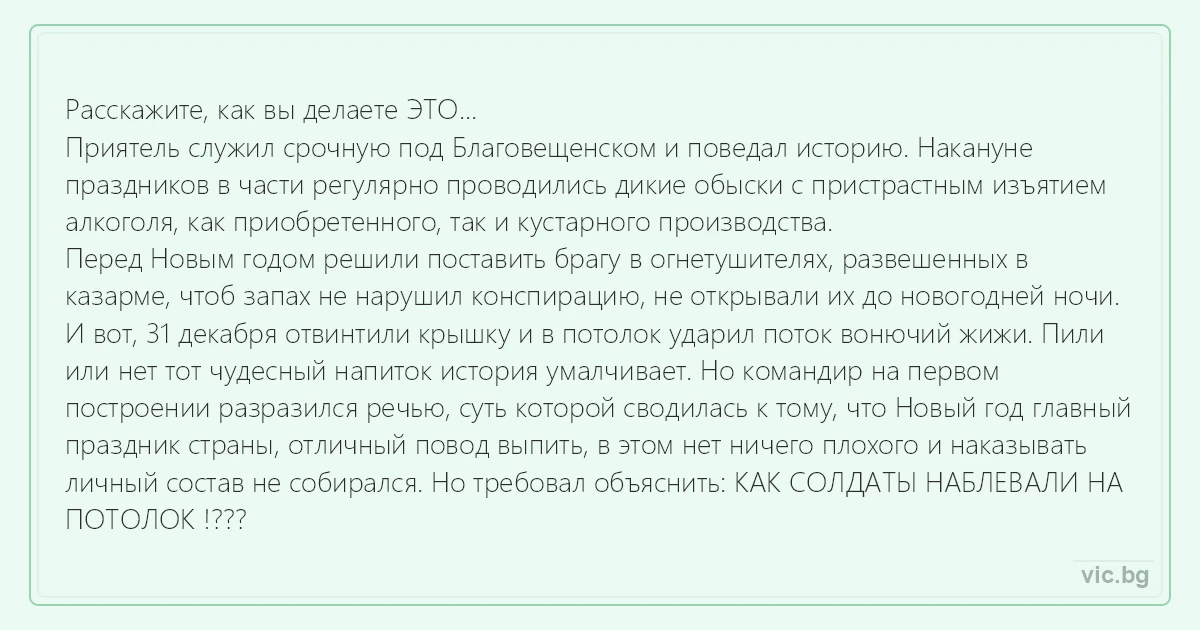Расскажите, как вы делаете ЭТО... Приятель служил срочную под Благовещенском и поведал историю. Накануне праздников в части регулярно проводились дикие обыски с пристрастным изъятием алкоголя, как приобретенного, так и кустарного производства. Перед Новым годом решили поставить брагу в огнетушителях, развешенных в казарме, чтоб запах не нарушил конспирацию, не открывали их до новогодней ночи. И вот, 31 декабря отвинтили крышку и в потолок ударил поток вонючий жижи. Пили или нет тот чудесный напиток история умалчивает. Но командир на первом построении разразился речью, суть которой сводилась к тому, что Новый год главный праздник страны, отличный повод выпить, в этом нет ничего плохого и наказывать личный состав не собирался. Но требовал объяснить: КАК СОЛДАТЫ НАБЛЕВАЛИ НА ПОТОЛОК !???