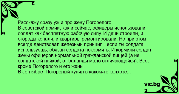 В советской армии, как и сейчас, офицеры использовали солдат как бесплатную рабочую силу. И дачи строили, и огороды копали, и квартиры ремонтировали. Но при этом всегда действовал железный принцип - если ты солдата используешь, обязан солдата покормить. И кормили солдат жены офицеров нормальной гражданской пищей (а не солдатской пайкой, от баланды мало отличающейся). Все, кроме Погорелого и его жены.