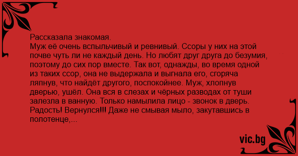 Муж её очень вспыльчивый и ревнивый. Ссоры у них на этой почве чуть ли не каждый день. Но любят друг друга до безумия, поэтому до сих пор вместе. Так вот, однажды, во время одной из таких ссор, она не выдержала и выгнала его, сгоряча ляпнув, что найдёт другого, поспокойнее. Муж, хлопнув дверью, ушёл. Она вся в слезах и чёрных разводах от туши залезла в ванную. Только намылила лицо - звонок в дверь. Радость! Вернулся!!! Даже не смывая мыло, закутавшись в полотенце, открыла дверь и, крикнув: "Подожди, я быстренько!!!», убежала смывать лицо. Даже не подозревала, бедняжка, что это сосед пришёл долг вернуть. А тут и правда муж решил вернуться, остыл, успокоился. Звонит в дверь. Она, опять же в полотенце, открывает. Только потом с ужасом замечает соседа, который сидит на диване и ждёт с деньгами в руках. Очень долго ей пришлось доказывать мужу свою невиновность!