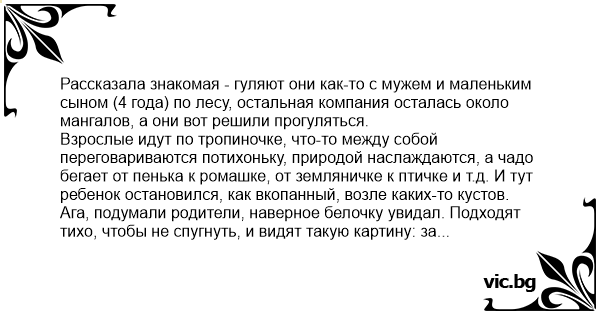 Рассказала знакомая - гуляют они как-то с мужем и маленьким сыном (4 года) по лесу, остальная компания осталась около мангалов, а они вот решили прогуляться.