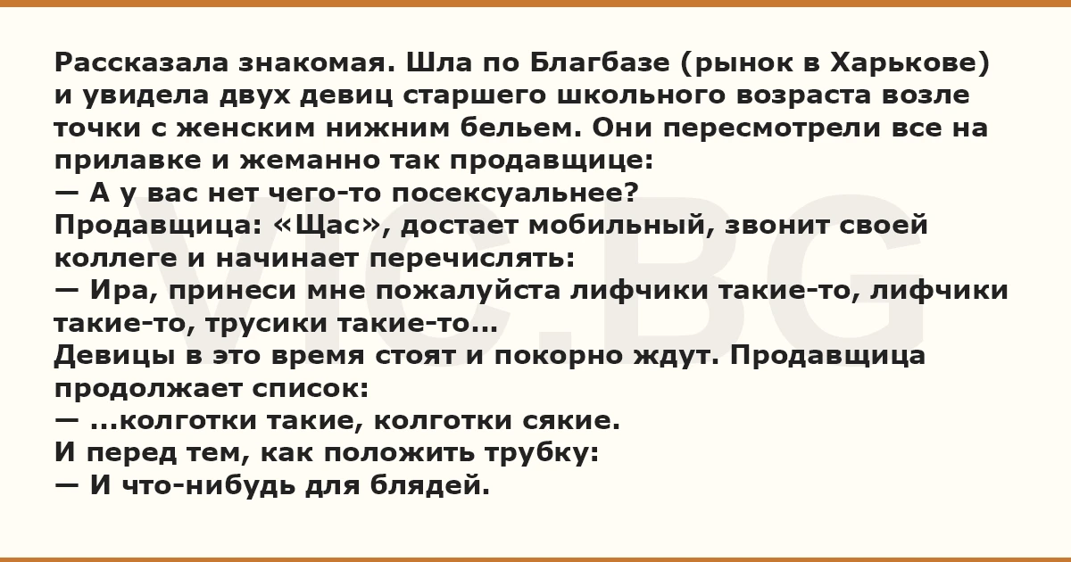 Рассказала знакомая. Шла по Благбазе (рынок в Харькове) и увидела двух девиц старшего школьного возраста возле точки с женским нижним бельем. Они пересмотрели все на прилавке и жеманно так продавщице: — А у вас нет чего-то посексуальнее? Продавщица: «Щас», достает мобильный, звонит своей коллеге и начинает перечислять: — Ира, принеси мне пожалуйста лифчики такие-то, лифчики такие-то, трусики такие-то... Девицы в это время стоят и покорно ждут. Продавщица продолжает список: — ...колготки такие, колготки сякие. И перед тем, как положить трубку: — И что-нибудь для блядей.