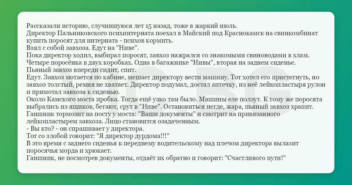 Рассказали историю, случившуюся лет 15 назад, тоже в жаркий июль. Директор Пальниковского психинтерната поехал в Майский под Краснокамск на свинкомбинат купить поросят для интерната - психов кормить. Взял с собой завхоза. Едут на "Ниве". Пока директор ходил, выбирал поросят, завхоз нажрался со знакомыми свиноводами в хлам. Четыре поросёнка в двух коробках. Одна в багажнике "Нивы", вторая на заднем сиденье. Пьяный завхоз впереди сидит, спит. Едут. Завхоз мотается по кабине, мешает директору вести машину. Тот хотел его пристегнуть, но завхоз толстый, ремня не хватает. Директор подумал, достал аптечку, из неё лейкопластыря рулон и примотал завхоза к сиденью. Около Камского моста пробка. Тогда ещё узко там было. Машины еле ползут. К тому же поросята выбрались из ящиков, бегают, срут в "Ниве". Остановиться негде, жара, пьяный завхоз храпит. Гаишник тормозит на посту у моста: "Ваши документы" и смотрит на привязанного лейкопластырем завхоза. Лицо становится озадаченным. - Вы кто? - он спрашивает у директора. Тот со злобой говорит: "Я директор дурдома!!!" В это время с заднего сиденья к переднему водительскому над плечом директора вылазит поросячья морда и хрюкает. Гаишник, не посмотрев документы, отдаёт их обратно и говорит: "Счастливого пути!"