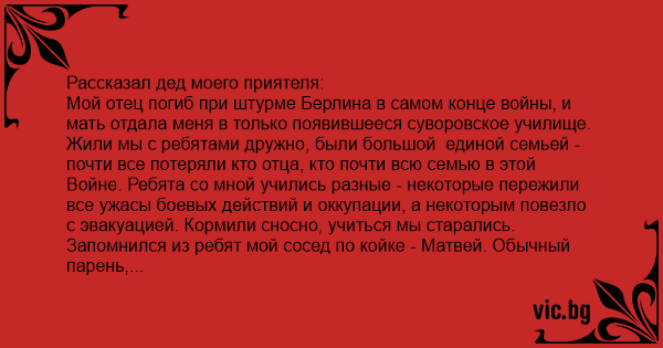 Жили мы с ребятами дружно, были большой единой семьей - почти все потеряли кто отца, кто почти всю семью в этой Войне. Ребята со мной учились разные - некоторые пережили все ужасы боевых действий и оккупации, а некоторым повезло с эвакуацией. Кормили сносно, учиться мы старались. Запомнился из ребят мой сосед по койке - Матвей. Обычный парень, прилежно учившийся и бывший среди лучших воспитанников. Матвей был задумчивым парнем, общался в основном об учебе, а о семье не рассказывал ничего. Да я и не расспрашивал особо.