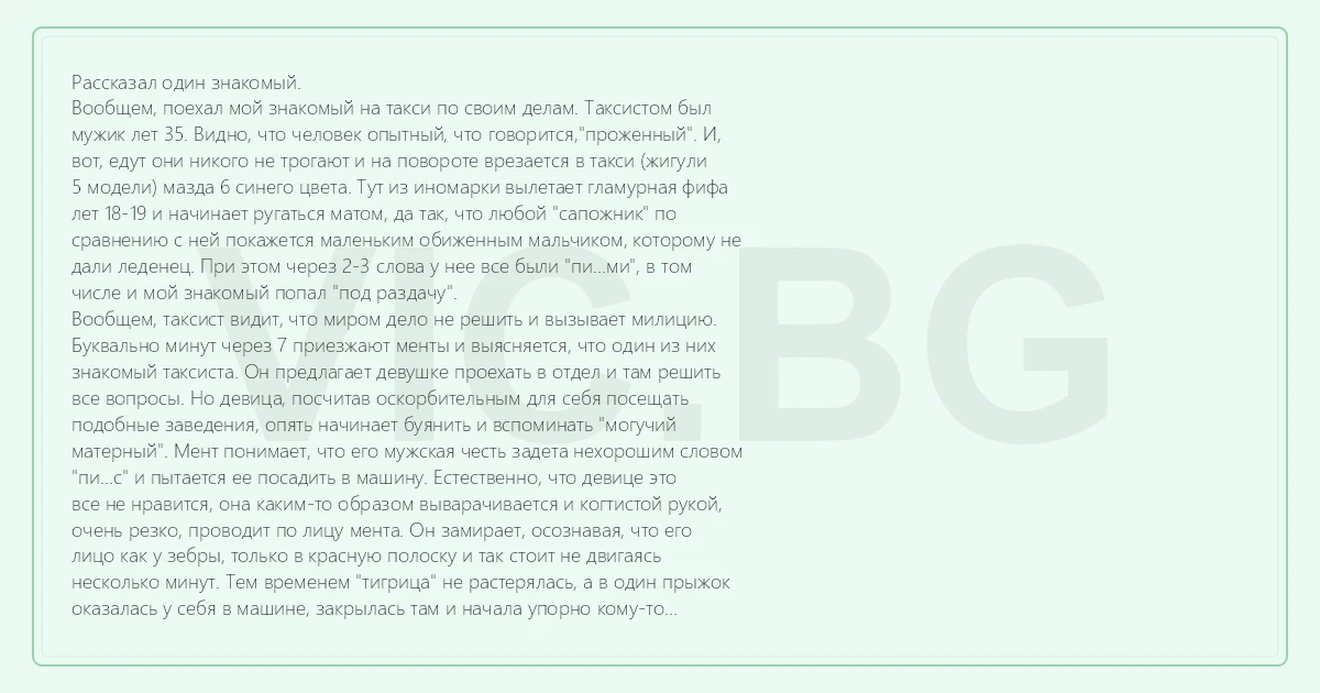 Рассказал один знакомый. Вообщем, поехал мой знакомый на такси по своим делам. Таксистом был мужик лет 35. Видно, что человек опытный, что говорится,"проженный". И, вот, едут они никого не трогают и на повороте врезается в такси (жигули 5 модели) мазда 6 синего цвета. Тут из иномарки вылетает гламурная фифа лет 18-19 и начинает ругаться матом, да так, что любой "сапожник" по сравнению с ней покажется маленьким обиженным мальчиком, которому не дали леденец. При этом через 2-3 слова у нее все были "пи...ми", в том числе и мой знакомый попал "под раздачу". Вообщем, таксист видит, что миром дело не решить и вызывает милицию. Буквально минут через 7 приезжают менты и выясняется, что один из них знакомый таксиста. Он предлагает девушке проехать в отдел и там решить все вопросы. Но девица, посчитав оскорбительным для себя посещать подобные заведения, опять начинает буянить и вспоминать "могучий матерный". Мент понимает, что его мужская честь задета нехорошим словом "пи...с" и пытается ее посадить в машину. Естественно, что девице это все не нравится, она каким-то образом выварачивается и когтистой рукой, очень резко, проводит по лицу мента. Он замирает, осознавая, что его лицо как у зебры, только в красную полоску и так стоит не двигаясь несколько минут. Тем временем "тигрица" не растерялась, а в один прыжок оказалась у себя в машине, закрылась там и начала упорно кому-то названивать. Хотя машина была закрыта, но разговор ее было слышно всем. А звучал он примерно так:"Мусик, мусик, приезжай, в меня врезались, мусик, менты меня хотят увезти, мусик, мусик, быстрее...!!!!!!!" Вообщем, мент, таксист, да, и мой знакомый призадумались. А вдруг сейчас приедит какой-нибудь "мусик" двухметрового роста с полным комплектом "золотых" достоинств и тогда всем будет весело. И где-то минут через 10 приезжает еще мазда 6, только черного цвета. Девица все сидит в машине, мент с расцарапанным лицом стоит рядом с на удивление спокойным таксистом, покуривающим сигарету, и мой знакомый, совершенно забывший куда и зачем он ехал. Короче, вся эта компашка с замиранием ожидает кто же сейчас появится из-за тонированной двери иномарки. Но увидив ЭТО у таксиста выпадает сигарета изо рта, т. к. подобное зрелище убило бы любого! Выходит "мусик" лет 60, 1,5 метра ростом, лысый, со стройным свисающим пузом!! Даааа, жесть!!!! Ну, естественно, тут начинается "разбор полетов" и все дружно едут в отдел. Там все благополучно разрешается. В итоге "мусик" обеднел на 80 тыс. рублей, а мой знакомый поехал дальше, забыв обо всем, названивая всем и каждому, чтобы рассказать о своих приключениях.