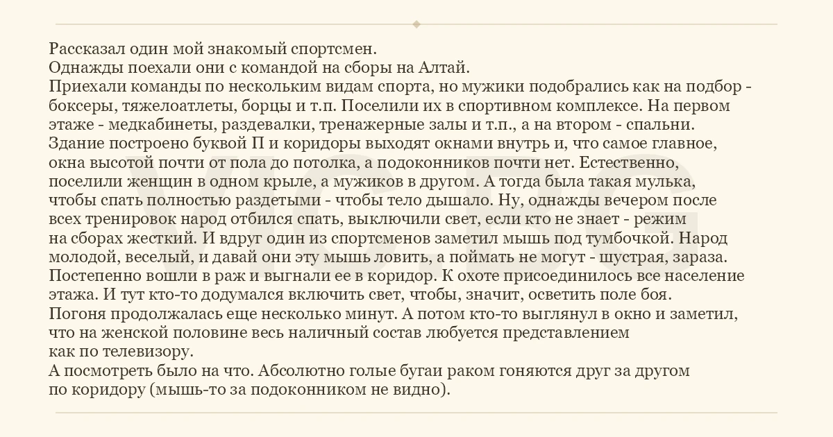 Рассказал один мой знакомый спортсмен. Однажды поехали они с командой на сборы на Алтай. Приехали команды по нескольким видам спорта, но мужики подобрались как на подбор - боксеры, тяжелоатлеты, борцы и т.п. Поселили их в спортивном комплексе. На первом этаже - медкабинеты, раздевалки, тренажерные залы и т.п., а на втором - спальни. Здание построено буквой П и коридоры выходят окнами внутрь и, что самое главное, окна высотой почти от пола до потолка, а подоконников почти нет. Естественно, поселили женщин в одном крыле, а мужиков в другом. А тогда была такая мулька, чтобы спать полностью раздетыми - чтобы тело дышало. Ну, однажды вечером после всех тренировок народ отбился спать, выключили свет, если кто не знает - режим на сборах жесткий. И вдруг один из спортсменов заметил мышь под тумбочкой. Народ молодой, веселый, и давай они эту мышь ловить, а поймать не могут - шустрая, зараза. Постепенно вошли в раж и выгнали ее в коридор. К охоте присоединилось все население этажа. И тут кто-то додумался включить свет, чтобы, значит, осветить поле боя. Погоня продолжалась еще несколько минут. А потом кто-то выглянул в окно и заметил, что на женской половине весь наличный состав любуется представлением как по телевизору. А посмотреть было на что. Абсолютно голые бугаи раком гоняются друг за другом по коридору (мышь-то за подоконником не видно).