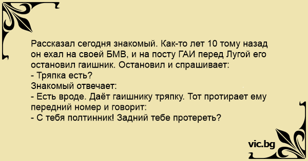 Рассказал сегодня знакомый. Как-то лет 10 тому назад он ехал на своей БМВ, и на посту ГАИ перед Лугой его остановил гаишник. Остановил и спрашивает: - Тряпка есть? Знакомый отвечает: - Есть вроде. Даёт гаишнику тряпку. Тот протирает ему передний номер и говорит: - С тебя полтинник! Задний тебе протереть?