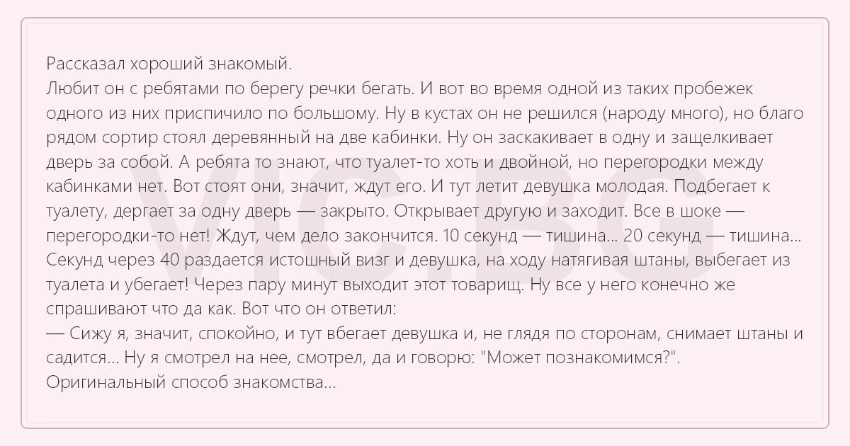 Рассказал хороший знакомый. Любит он с ребятами по берегу речки бегать. И вот во время одной из таких пробежек одного из них приспичило по большому. Ну в кустах он не решился (народу много), но благо рядом сортир стоял деревянный на две кабинки. Ну он заскакивает в одну и защелкивает дверь за собой. А ребята то знают, что туалет-то хоть и двойной, но перегородки между кабинками нет. Вот стоят они, значит, ждут его. И тут летит девушка молодая. Подбегает к туалету, дергает за одну дверь — закрыто. Открывает другую и заходит. Все в шоке — перегородки-то нет! Ждут, чем дело закончится. 10 секунд — тишина... 20 секунд — тишина... Секунд через 40 раздается истошный визг и девушка, на ходу натягивая штаны, выбегает из туалета и убегает! Через пару минут выходит этот товарищ. Ну все у него конечно же спрашивают что да как. Вот что он ответил: — Сижу я, значит, спокойно, и тут вбегает девушка и, не глядя по сторонам, снимает штаны и садится... Ну я смотрел на нее, смотрел, да и говорю: "Может познакомимся?". Оригинальный способ знакомства...