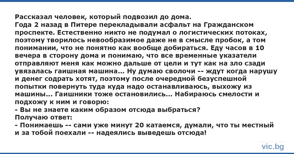 Года 2 назад в Питере перекладывали асфальт на Гражданском проспекте. Естественно никто не подумал о логистических потоках, поэтому творилось невообразимое даже не в смысле пробок, а том понимании, что не понятно как вообще добираться. Еду часов в 10 вечера в сторону дома и понимаю, что все временные указатели отправляют меня как можно дальше от цели и тут как на зло сзади увязалась гаишная машина... Ну думаю сволочи -- ждут когда нарушу и денег содрать хотят, поэтому после очередной безуспешной попытки повернуть туда куда надо останавливаюсь, выхожу из машины... Гаишники тоже остановились... Набираюсь смелости и подхожу к ним и говорю: