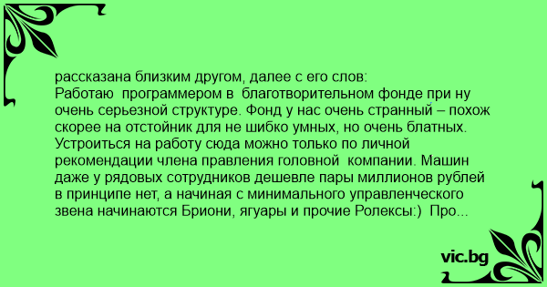 Работаю программером в благотворительном фонде при ну очень серьезной структуре. Фонд у нас очень странный – похож скорее на отстойник для не шибко умных, но очень блатных. Устроиться на работу сюда можно только по личной рекомендации члeнa правления головной компании. Машин даже у рядовых сотрудников дешевле пары миллионов рублей в принципе нет, а начиная с минимального управленческого звена начинаются Бриони, ягуары и прочие Ролексы:) Про руководство можно даже не говорить – слухи о площадях их особняков и квартир будоражат умы простых граждан. Но собственно ненависти никто не вызывает - украсть у нас негде, и все эти понты просто часть состояния семей из которых наш персонал происходит. Сама история собственно, не об этом. Работает у нас один мужичок. Валерий Пертович. Ему 70 с легким хвостиком, но при этом все тяжелые командировки в самую глухомань – его. Валерий Петрович всегда поможет, подменит, научит, пропустит мимо ушей ехидные смешки и просто делает своё дело. Валерий Петрович прост и главное – он ВООБЩЕ не реагирует на понты окружающих. Тут нужно заметить одну деталь – есть множество людей, которые ведут себя точно так же, но практически все они имеют серьезные активы и просто не выпендриваются. А у остальных где-то внутри чаще всего сидит глубокая неприязнь к такого рода «выскочкам», коими укомплектован наш отдел. Есть конечно ещё люди « не от мира сего», но таким в нашу структуру дорога закрыта.