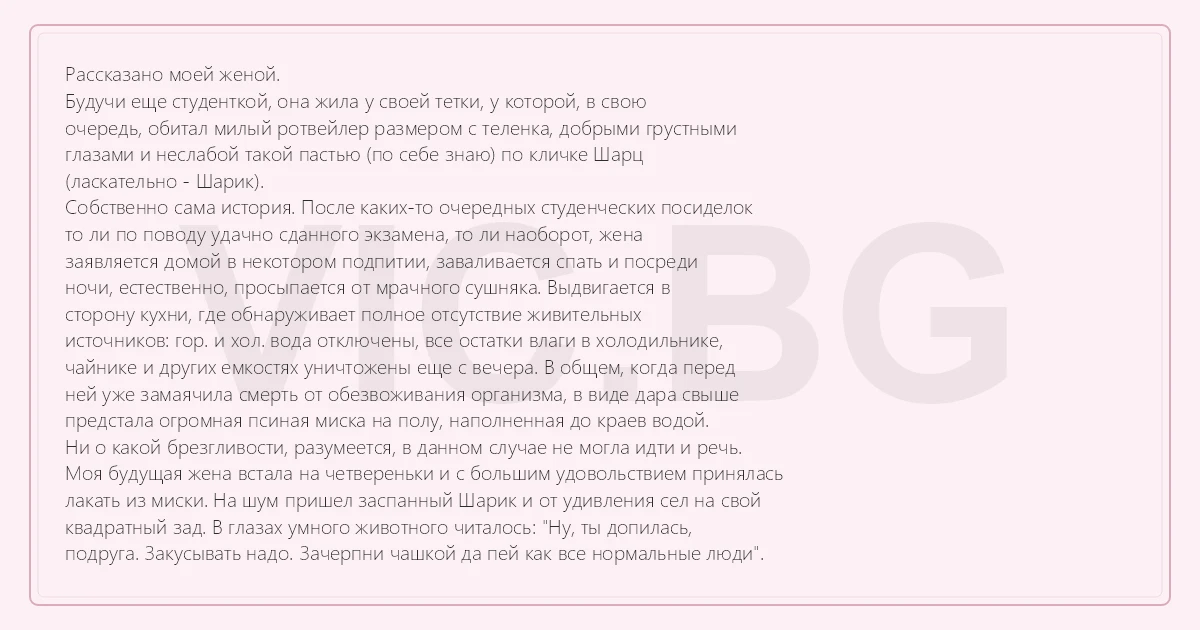 Рассказано моей женой. Будучи еще студенткой, она жила у своей тетки, у которой, в свою очередь, обитал милый ротвейлер размером с теленка, добрыми грустными глазами и неслабой такой пастью (по себе знаю) по кличке Шарц (ласкательно - Шарик). Собственно сама история. После каких-то очередных студенческих посиделок то ли по поводу удачно сданного экзамена, то ли наоборот, жена заявляется домой в некотором подпитии, заваливается спать и посреди ночи, естественно, просыпается от мрачного сушняка. Выдвигается в сторону кухни, где обнаруживает полное отсутствие живительных источников: гор. и хол. вода отключены, все остатки влаги в холодильнике, чайнике и других емкостях уничтожены еще с вечера. В общем, когда перед ней уже замаячила смерть от обезвоживания организма, в виде дара свыше предстала огромная псиная миска на полу, наполненная до краев водой. Ни о какой брезгливости, разумеется, в данном случае не могла идти и речь. Моя будущая жена встала на четвереньки и с большим удовольствием принялась лакать из миски. На шум пришел заспанный Шарик и от удивления сел на свой квадратный зад. В глазах умного животного читалось: "Ну, ты допилась, подруга. Закусывать надо. Зачерпни чашкой да пей как все нормальные люди".