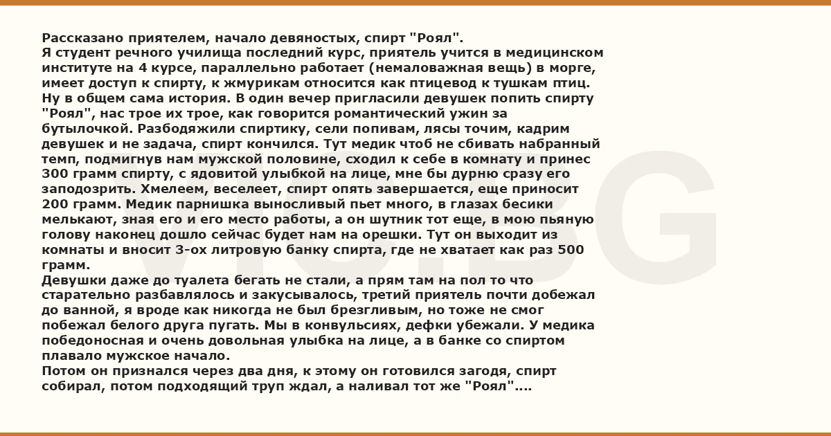 Рассказано приятелем, начало девяностых, спирт "Роял". Я студент речного училища последний курс, приятель учится в медицинском институте на 4 курсе, параллельно работает (немаловажная вещь) в морге, имеет доступ к спирту, к жмурикам относится как птицевод к тушкам птиц. Ну в общем сама история. В один вечер пригласили девушек попить спирту "Роял", нас трое их трое, как говорится романтический ужин за бутылочкой. Разбодяжили спиртику, сели попивам, лясы точим, кадрим девушек и не задача, спирт кончился. Тут медик чтоб не сбивать набранный темп, подмигнув нам мужской половине, сходил к себе в комнату и принес 300 грамм спирту, с ядовитой улыбкой на лице, мне бы дурню сразу его заподозрить. Хмелеем, веселеет, спирт опять завершается, еще приносит 200 грамм. Медик парнишка выносливый пьет много, в глазах бесики мелькают, зная его и его место работы, а он шутник тот еще, в мою пьяную голову наконец дошло сейчас будет нам на орешки. Тут он выходит из комнаты и вносит 3-ох литровую банку спирта, где не хватает как раз 500 грамм. Девушки даже до туалета бегать не стали, а прям там на пол то что старательно разбавлялось и закусывалось, третий приятель почти добежал до ванной, я вроде как никогда не был брезгливым, но тоже не смог побежал белого друга пугать. Мы в конвульсиях, дефки убежали. У медика победоносная и очень довольная улыбка на лице, а в банке со спиртом плавало мужское начало. Потом он признался через два дня, к этому он готовился загодя, спирт собирал, потом подходящий труп ждал, а наливал тот же "Роял". Да но эти два дня дались очень тяжело и после этого я не люблю спирт. Якорь