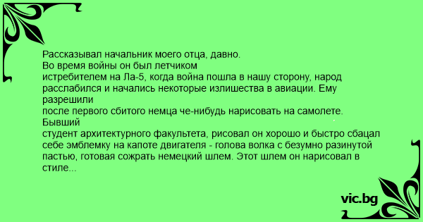 Рассказывал начальник моего отца, давно. Во время войны он был летчиком истребителем на Ла-5, когда война пошла в нашу сторону, народ расслабился и начались некоторые излишества в авиации. Ему разрешили после первого сбитого немца че-нибудь нарисовать на самолете. Бывший студент архитектурного факультета, рисовал он хорошо и быстро сбацал себе эмблемку на капоте двигателя - голова волка с безумно разинутой пастью, готовая сожрать немецкий шлем. Этот шлем он нарисовал в стиле Бисмарковских, с такой луковицей на макушке. Полетал с рисунком несколько недель, а потом попал в маленькую переделку где ему немецкий снаряд попал в кожух двигателя. Приземлился, капот поврежден, кусок оторван, что не оторвано то помято. Снаряд изуродовал как раз ту часть изображения шлема которая ниже "луковицы". При первом же взгляде было понятно что его героический волк раскрыл пасть на кучу собачьего говна, настолько трансформировался рисунок. Так и служил капитан Поляков до конца войны под кличкой "Говноед".