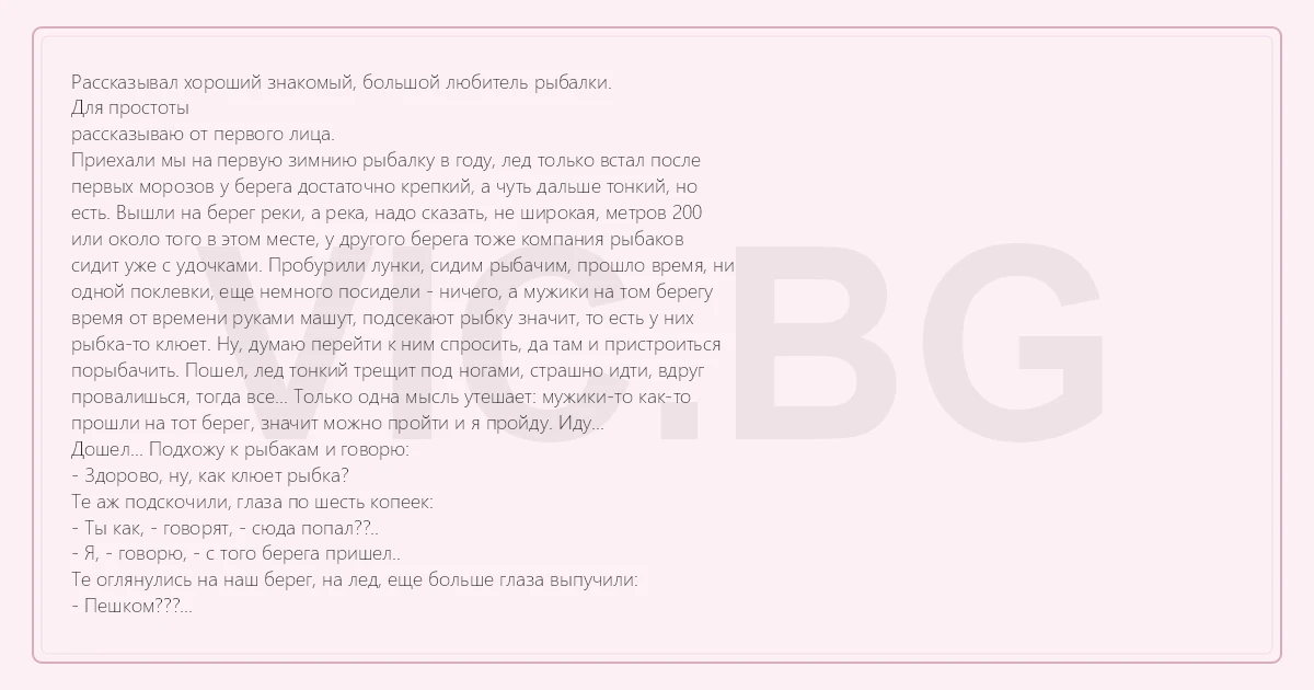 Рассказывал хороший знакомый, большой любитель рыбалки. Для простоты рассказываю от первого лица. Приехали мы на первую зимнию рыбалку в году, лед только встал после первых морозов у берега достаточно крепкий, а чуть дальше тонкий, но есть. Вышли на берег реки, а река, надо сказать, не широкая, метров 200 или около того в этом месте, у другого берега тоже компания рыбаков сидит уже с удочками. Пробурили лунки, сидим рыбачим, прошло время, ни одной поклевки, еще немного посидели - ничего, а мужики на том берегу время от времени руками машут, подсекают рыбку значит, то есть у них рыбка-то клюет. Ну, думаю перейти к ним спросить, да там и пристроиться порыбачить. Пошел, лед тонкий трещит под ногами, страшно идти, вдруг провалишься, тогда все... Только одна мысль утешает: мужики-то как-то прошли на тот берег, значит можно пройти и я пройду. Иду... Дошел... Подхожу к рыбакам и говорю: - Здорово, ну, как клюет рыбка? Те аж подскочили, глаза по шесть копеек: - Ты как, - говорят, - сюда попал??.. - Я, - говорю, - с того берега пришел.. Те оглянулись на наш берег, на лед, еще больше глаза выпучили: - Пешком??? Я говорю: - Да, а что? Они: - Ох...ел, мы сюда на ЛОДКЕ приплыли!!! Меня чуть кондратий не обнял при мысли, что я шел по такому льду. В общем, как добрался обратно не суть, рыбалка в тот день не удалась. Югов.