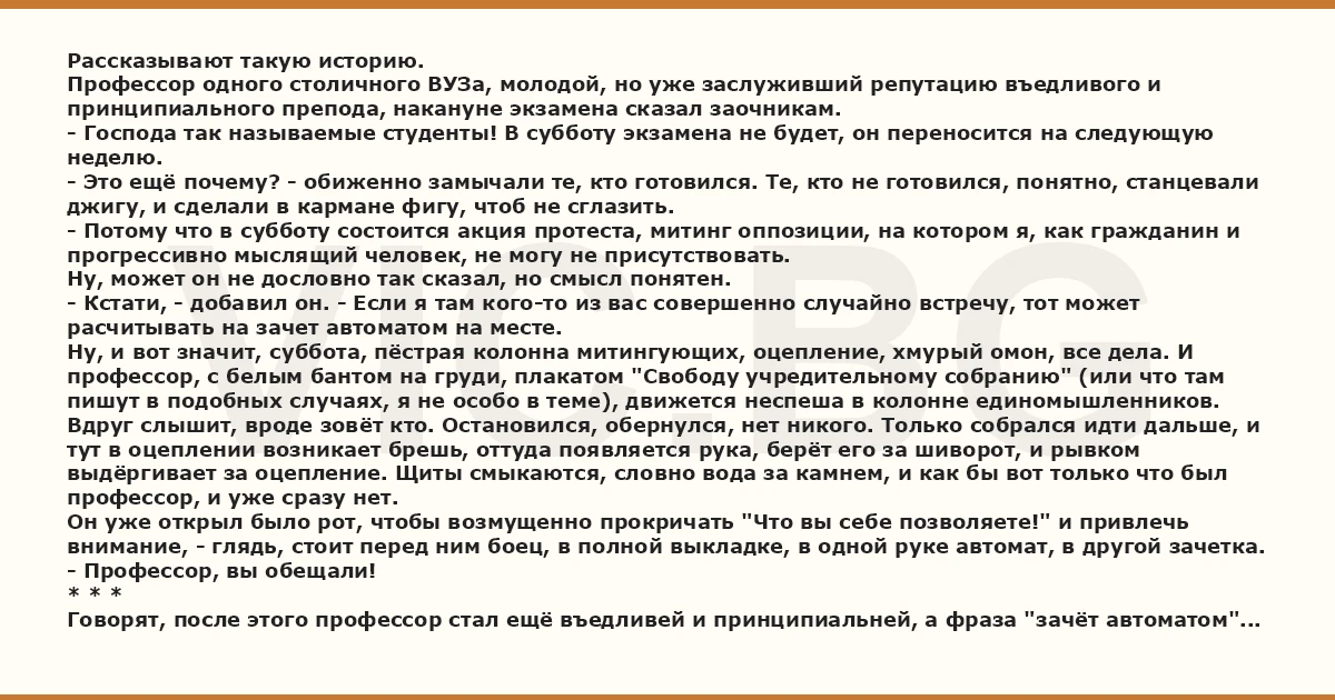 Рассказывают такую историю. Профессор одного столичного ВУЗа, молодой, но уже заслуживший репутацию въедливого и принципиального препода, накануне экзамена сказал заочникам. - Господа так называемые студенты! В субботу экзамена не будет, он переносится на следующую неделю. - Это ещё почему? - обиженно замычали те, кто готовился. Те, кто не готовился, понятно, станцевали джигу, и сделали в кармане фигу, чтоб не сглазить. - Потому что в субботу состоится акция протеста, митинг оппозиции, на котором я, как гражданин и прогрессивно мыслящий человек, не могу не присутствовать. Ну, может он не дословно так сказал, но смысл понятен. - Кстати, - добавил он. - Если я там кого-то из вас совершенно случайно встречу, тот может расчитывать на зачет автоматом на месте. Ну, и вот значит, суббота, пёстрая колонна митингующих, оцепление, хмурый омон, все дела. И профессор, с белым бантом на груди, плакатом "Свободу учредительному собранию" (или что там пишут в подобных случаях, я не особо в теме), движется неспеша в колонне единомышленников. Вдруг слышит, вроде зовёт кто. Остановился, обернулся, нет никого. Только собрался идти дальше, и тут в оцеплении возникает брешь, оттуда появляется рука, берёт его за шиворот, и рывком выдёргивает за оцепление. Щиты смыкаются, словно вода за камнем, и как бы вот только что был профессор, и уже сразу нет. Он уже открыл было рот, чтобы возмущенно прокричать "Что вы себе позволяете!" и привлечь внимание, - глядь, стоит перед ним боец, в полной выкладке, в одной руке автомат, в другой зачетка. - Профессор, вы обещали! * * * Говорят, после этого профессор стал ещё въедливей и принципиальней, а фраза "зачёт автоматом" навсегда исчезла из его лексикона.