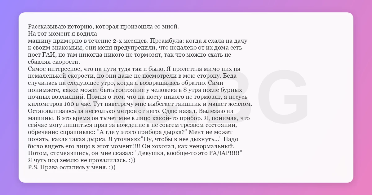 Рассказываю историю, которая произошла со мной. На тот момент я водила машину примерно в течение 2-х месяцев. Преамбула: когда я ехала на дачу к своим знакомым, они меня предупредили, что недалеко от их дома есть пост ГАИ, но там никогда никого не тормозят, так что можно ехать не сбавляя скорости. Самое интересное, что на пути туда так и было. Я пролетела мимо них на немаленькой скорости, но они даже не посмотрели в мою сторону. Беда случилась на следующее утро, когда я возвращалась обратно. Сами понимаете, какое может быть состояние у человека в 8 утра после бурных ночных возлияний. Помня о том, что на посту никого не тормозят, я несусь километров 100 в час. Тут навстречу мне выбегает гаишник и машет жезлом. Останавливаюсь за несколько метров от него. Сдаю назад. Вылезаю из машины. В это время он тычет мне в лицо какой-то прибор. Я, понимая, что сейчас могу лишиться прав за вождение в не совсем трезвом состоянии, обреченно спрашиваю: "А где у этого прибора дырка?" Мент не может понять, какая такая дырка. Я уточняю:"Ну, чтобы в нее дыхнуть..." Надо было видеть его лицо в этот момент!!!! Он хохотал, как ненормальный. Потом, отсмеявшись, он мне сказал: "Девушка, вообще-то это РАДАР!!!!!" Я чуть под землю не провалилась. :)) P.S. Права остались у меня. :))
