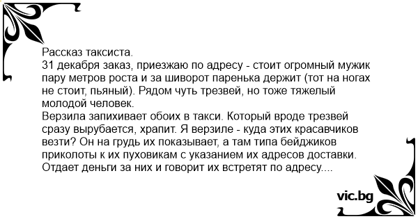 Верзила запихивает обоих в такси. Который вроде трезвей сразу вырубается, храпит. Я верзиле - куда этих красавчиков везти? Он на грудь их показывает, а там типа бейджиков приколоты к их пуховикам с указанием их адресов доставки. Отдает деньги за них и говорит их встретят по адресу. Подъезжаю по адресу, стоит женщина молодая, говорит "А вы не моего привезли?" Я говорю выбирай любого. Она смотрит и кричит радостно: