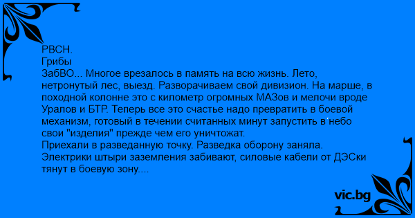 РВСН. Грибы ЗабВО... Многое врезалось в память на всю жизнь. Лето, нетронутый лес, выезд. Разворачиваем свой дивизион. На марше, в походной колонне это с километр огромных МАЗов и мелочи вроде Уралов и БТР. Теперь все это счастье надо превратить в боевой механизм, готовый в течении считанных минут запустить в небо свои "изделия" прежде чем его уничтожат. Приехали в разведанную точку. Разведка оборону заняла. Электрики штыри заземления забивают, силовые кабели от ДЭСки тянут в боевую зону. Асошники "Струну" с "Пеоном" разворачивают. СПУшки встают на гидравлические опоры. Все при деле. Кто КМП над машинами разворачивает, кто связь налаживает, кто обед готовит. Снижение боеготовности заканчивается - офицеры нервничают. А под ногами грибы. Черт его знает, какие - я не грибник. На благородные грибы непохоже. На сыроежки тоже. Может поганки. Но СТОЛЬКО грибов я не то что не видел - даже представить себе не мог. Вся земля покрыта грибами, насколько хватает глаз. И как покрыта! Грибы стоят шляпка к шляпке, а между шляпками протискиваются травинки. Зрелище совершенно нереальное. Идешь, и прокладываешь тропинку в грибах - на каждом шаге сбиваешь штук семь - грибы среднего размера. Много червивых. Наверное год был аномальный - мы то в том лесу еще не разворачивались...
