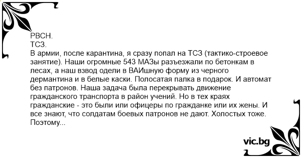 РВСН. ТСЗ. В армии, после карантина, я сразу попал на ТСЗ (тактико-строевое занятие). Наши огромные 543 МАЗы разъезжали по бетонкам в лесах, а наш взвод одели в ВАИшную форму из черного дермантина и в белые каски. Полосатая палка в подарок. И автомат без патронов. Наша задача была перекрывать движение гражданского транспорта в район учений. Но в тех краях гражданские - это были или офицеры по гражданке или их жены. И все знают, что солдатам боевых патронов не дают. Холостых тоже. Поэтому проезжают внаглую. Когда стемнело, должна была пройти наша колонна. Я уже собрался махать своей палочкой. И тогда мой первый сержант сказал самую умную вещь, которую я от него слышал: "Главное правило - держись подальше от дороги. У нас такие асы-водители - полгода в полы втираются (моют полы) а потом садятся за руль 30 тонных машин".