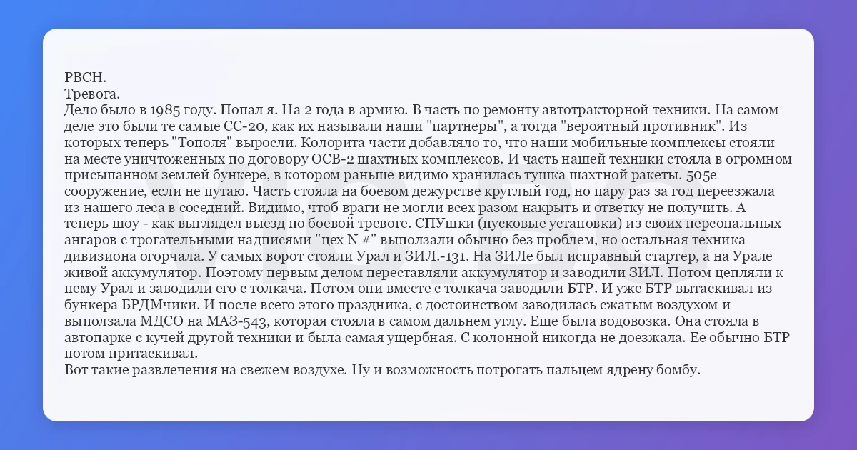 РВСН. Тревога. Дело было в 1985 году. Попал я. На 2 года в армию. В часть по ремонту автотракторной техники. На самом деле это были те самые СС-20, как их называли наши "партнеры", а тогда "вероятный противник". Из которых теперь "Тополя" выросли. Колорита части добавляло то, что наши мобильные комплексы стояли на месте уничтоженных по договору ОСВ-2 шахтных комплексов. И часть нашей техники стояла в огромном присыпанном землей бункере, в котором раньше видимо хранилась тушка шахтной ракеты. 505е сооружение, если не путаю. Часть стояла на боевом дежурстве круглый год, но пару раз за год переезжала из нашего леса в соседний. Видимо, чтоб враги не могли всех разом накрыть и ответку не получить. А теперь шоу - как выглядел выезд по боевой тревоге. СПУшки (пусковые установки) из своих персональных ангаров с трогательными надписями "цех N #" выползали обычно без проблем, но остальная техника дивизиона огорчала. У самых ворот стояли Урал и ЗИЛ.-131. На ЗИЛе был исправный стартер, а на Урале живой аккумулятор. Поэтому первым делом переставляли аккумулятор и заводили ЗИЛ. Потом цепляли к нему Урал и заводили его с толкача. Потом они вместе с толкача заводили БТР. И уже БТР вытаскивал из бункера БРДМчики. И после всего этого праздника, с достоинством заводилась сжатым воздухом и выползала МДСО на МАЗ-543, которая стояла в самом дальнем углу. Еще была водовозка. Она стояла в автопарке с кучей другой техники и была самая ущербная. С колонной никогда не доезжала. Ее обычно БТР потом притаскивал. Вот такие развлечения на свежем воздухе. Ну и возможность потрогать пальцем ядрену бомбу.