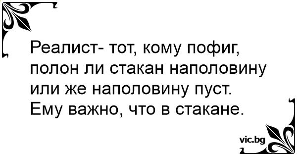 Реалист- тот, кому пофиг, полон ли стакан наполовину или же наполовину пуст. Ему важно, что в стакане.