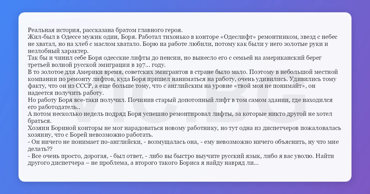 Реальная история, рассказана братом главного героя. Жил-был в Одессе мужик один, Боря. Работал тихонько в конторе «Одеслифт» ремонтником, звезд с небес не хватал, но на хлеб с маслом хватало. Борю на работе любили, потому как были у него золотые руки и незлобный характер. Так бы и чинил себе Боря одесские лифты до пенсии, но вынесло его с семьей на американский берег третьей волной русской эмиграции в 197... году. В то золотое для Америки время, советских эмигрантов в стране было мало. Поэтому в небольшой местной компании по ремонту лифтов, куда Боря пришел наниматься на работу, очень удивились. Удивились тому факту, что он из СССР, а еще больше тому, что с английским на уровне «твой моя не понимайт», он надеется получить работу. Но работу Боря все-таки получил. Починив старый допотопный лифт в том самом здании, где находился его работодатель.. А потом несколько недель подряд Боря успешно ремонтировал лифты, за которые никто другой не хотел браться. Хозяин Бориной конторы не мог нарадоваться новому работнику, но тут одна из диспетчеров пожаловалась хозяину, что с Борей невозможно работать. - Он ничего не понимает по-английски, - возмущалась она, - ему невозможно ничего объяснить, ну что мне делать?? - Все очень просто, дорогая, - был ответ, - либо вы быстро выучите русский язык, либо я вас уволю. Найти другого диспетчера – не проблема, а второго такого Бориса я найду навряд ли...