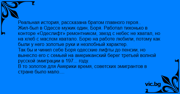 Жил-был в Одессе мужик один, Боря. Работал тихонько в конторе «Одеслифт» ремонтником, звезд с небес не хватал, но на хлеб с маслом хватало. Борю на работе любили, потому как были у него золотые руки и незлобный характер.