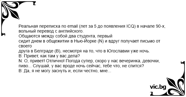 Реальная переписка по email (лет за 5 до появления ICQ) в начале 90-х, вольный перевод с английского.
