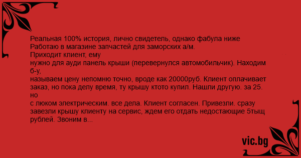 Реальная 100% история, лично свидетель, однако фабула ниже Работаю в магазине запчастей для заморских а/м.