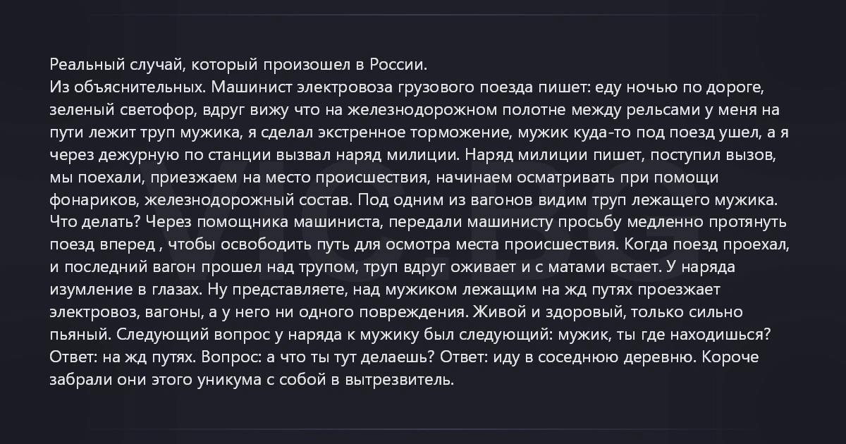 Реальный случай, который произошел в России. Из объяснительных. Машинист электровоза грузового поезда пишет: еду ночью по дороге, зеленый светофор, вдруг вижу что на железнодорожном полотне между рельсами у меня на пути лежит труп мужика, я сделал экстренное торможение, мужик куда-то под поезд ушел, а я через дежурную по станции вызвал наряд милиции. Наряд милиции пишет, поступил вызов, мы поехали, приезжаем на место происшествия, начинаем осматривать при помощи фонариков, железнодорожный состав. Под одним из вагонов видим труп лежащего мужика. Что делать? Через помощника машиниста, передали машинисту просьбу медленно протянуть поезд вперед , чтобы освободить путь для осмотра места происшествия. Когда поезд проехал, и последний вагон прошел над трупом, труп вдруг оживает и с матами встает. У наряда изумление в глазах. Ну представляете, над мужиком лежащим на жд путях проезжает электровоз, вагоны, а у него ни одного повреждения. Живой и здоровый, только сильно пьяный. Следующий вопрос у наряда к мужику был следующий: мужик, ты где находишься? Ответ: на жд путях. Вопрос: а что ты тут делаешь? Ответ: иду в соседнюю деревню. Короче забрали они этого уникума с собой в вытрезвитель.