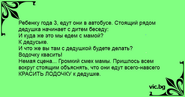Ребенку года 3, едут они в автобусе. Стоящий рядом дедушка начинает с дитем беседу: И куда же это мы едем с мамой? К дедуське. И что же вы там с дедушкой будете делать? Водочку квасить! Немая сцена... Громкий смех мамы. Пришлось всем вокруг стоящим объяснять, что они едут всего-навсего КРАСИТЬ ЛОДОЧКУ к дедушке.