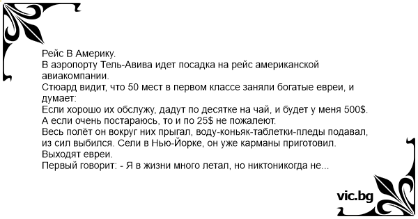 Стоит стюард на трапе, машет чеком вслед евреям и шепчет: