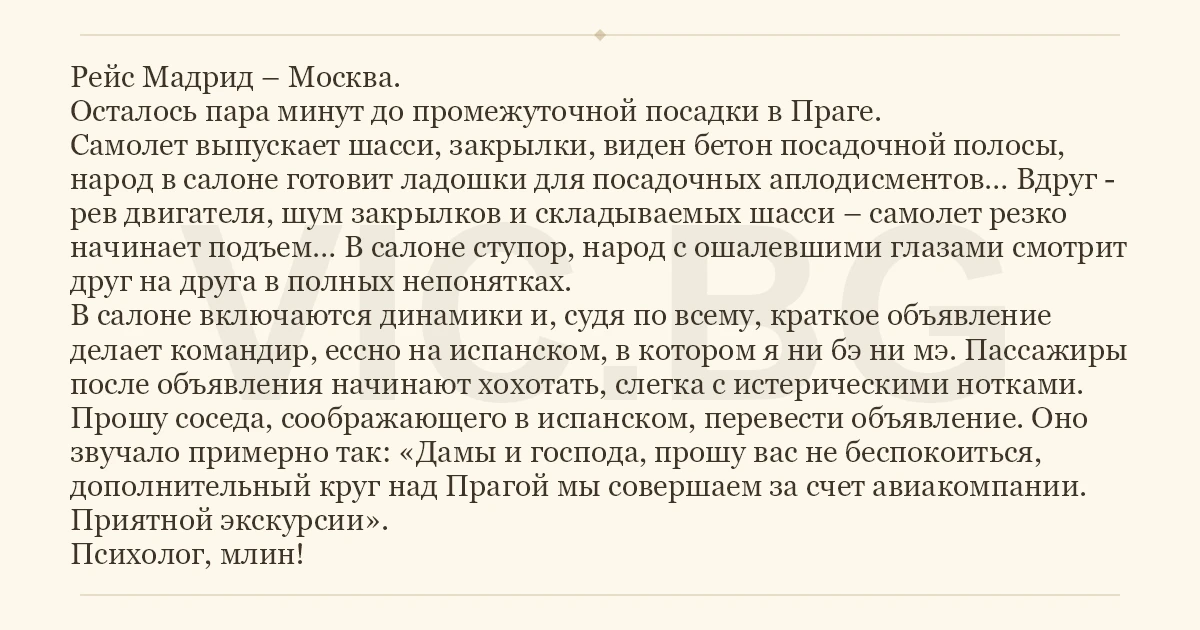 Рейс Мадрид – Москва. Осталось пара минут до промежуточной посадки в Праге. Самолет выпускает шасси, закрылки, виден бетон посадочной полосы, народ в салоне готовит ладошки для посадочных аплодисментов… Вдруг - рев двигателя, шум закрылков и складываемых шасси – самолет резко начинает подъем… В салоне ступор, народ с ошалевшими глазами смотрит друг на друга в полных непонятках. В салоне включаются динамики и, судя по всему, краткое объявление делает командир, ессно на испанском, в котором я ни бэ ни мэ. Пассажиры после объявления начинают хохотать, слегка с истерическими нотками. Прошу соседа, соображающего в испанском, перевести объявление. Оно звучало примерно так: «Дамы и господа, прошу вас не беспокоиться, дополнительный круг над Прагой мы совершаем за счет авиакомпании. Приятной экскурсии». Психолог, млин!
