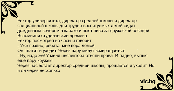 Ректор университета, директор средней школы и директор специальной школы для трудно воспитуемых детей сидят дождливым вечером в кабаке и пьют пиво за дружеской беседой.