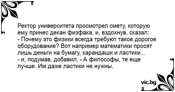 - Почему это физики всегда требуют такое дорогое оборудование? Вот например математики просят лишь деньги на бумагу, карандаши и ластики...