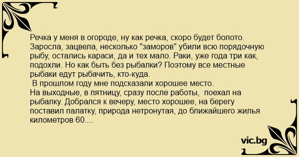 На выходные, в пятницу, сразу после работы, поехал на рыбалку. Добрался к вечеру, место хорошее, на берегу поставил палатку, природа нетронутая, до ближайшего жилья километров 60. Завалился спать и как только стало рассветать, я уже закидывал удочки. В субботу весь день рыбачил, проверил на лодке все "подозрительные" места.