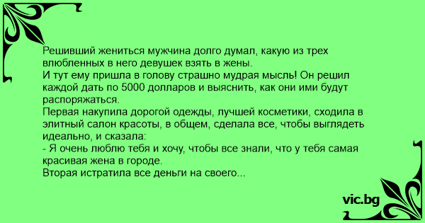 И тут ему пришла в голову страшно мудрая мысль! Он решил каждой дать по 5000 долларов и выяснить, как они ими будут распоряжаться.