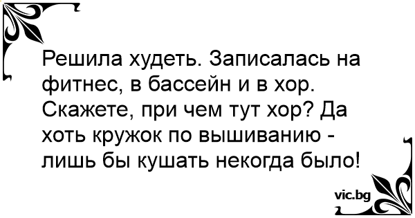 Решила худеть. Записалась на фитнес, в бассейн и в хор. Скажете, при чем тут хор? Да хоть кружок по вышиванию - лишь бы кушать некогда было!