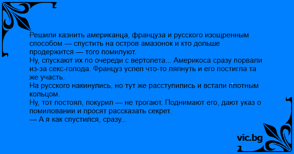 Решили казнить американца, француза и русского изощренным способом — спустить на остров амазонок и кто дольше продержится — того помилуют.