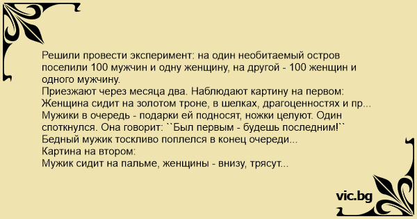 Решили провести эксперимент: на один необитаемый остров поселили 100 мужчин и одну женщину, на другой - 100 женщин и одного мужчину.