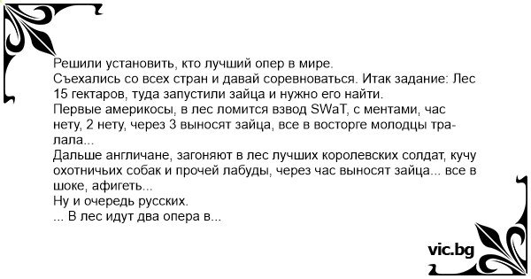 Решили установить, кто лучший опер в мире. Съехались со всех стран и давай соревноваться. Итак задание: Лес 15 гектаров, туда запустили зайца и нужно его найти. Первые америкосы, в лес ломится взвод SWаT, с ментами, час нету, 2 нету, через 3 выносят зайца, все в восторге молодцы тра-лала... Дальше англичане, загоняют в лес лучших королевских солдат, кучу охотничьих собак и прочей лабуды, через час выносят зайца... все в шоке, афигеть... Ну и очередь русских. ... В лес идут два опера в форме с палочками, все начали возмущаться: - Мужики, вы куда, вы там пару дней просидите. Опера - Все нормально. - Да ну, бл@, мы задолбаемся вас тут ждать. - Все нормально. Короче вошли в лес. В лесу шум, треск, крики. Через 15 минут выходят! Выводят медведя в наручниках. Подводят к судьям. Медведь: - Где тут расписаться, я-заяц! ))))