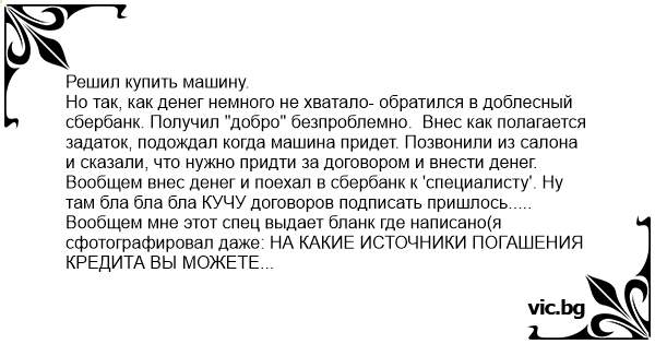 Но так, как денег немного не хватало- обратился в доблесный сбербанк. Получил "добро" безпроблемно. Внес как полагается задаток, подождал когда машина придет. Позвонили из салона и сказали, что нужно придти за договором и внести денег. Вообщем внес денег и поехал в сбербанк к 'специалисту'. Ну там бла бла бла КУЧУ договоров подписать пришлось..... Вообщем мне этот спец выдает бланк где написано(я сфотографировал даже: НА КАКИЕ ИСТОЧНИКИ ПОГАШЕНИЯ КРЕДИТА ВЫ МОЖЕТЕ РАССЧИТЫВАТЬ В СЛУЧАЕ НАСТУПЛЕНИЯ РИСКОВ ПОТЕРИ ТРУДОСПОСОБНОСТИ И УХОДА ИЗ ЖИЗНИ !!!! Я на минуточку представил себя(тьфу тьфу тьфу)- лежу я в гробу и думаю: как же там сбербанк то ?
