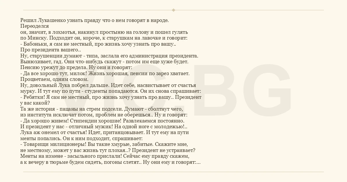 Решил Лукашенко узнать правду что о нем говорят в народе. Переоделся он, значит, в лохмотья, накинул простыню на голову и пошел гулять по Минску. Подходит он, короче, к старушкам на лавочке и говорит: - Бабоньки, я сам не местный, про жизнь хочу узнать про вашу.. Про президента вашего.. Ну, старушенции думают - типа, заслала его администрация президента. Вынюхивает, гад. Они что-нибудь скажут - потом им еще хуже будет. Пенсию урежут до предела. Ну они и говорят: - Да все хорошо тут, милок! Жизнь хорошая, пенсии по зарез хватает. Процветаем, одним словом. Ну, довольный Лука побрел дальше. Идет себе, насвистывает от счастья мурку. И тут ему по пути - студенты попадаются. Он их снова спрашивает: - Ребятки! Я сам не местный, про жизнь хочу узнать про вашу.. Президент у вас какой? Та же история - пацаны на стрем подсели. Думают - сболтнут чего, из института исключат потом, проблем не оберешься.. Ну и говорят: - Да хорошо живем! Стипендии хорошие! Развлекаемся постоянно. И президент у нас - отличный мужик! На одной ноге с молодежью!.. Лука аж онемел от счастья! Идет, пританцовывает. И тут ему на пути менты попались. Он к ним подходит, спрашивает: - Товарищи милиционеры! Вы такие хмурые, забитые. Скажите мне, не местному, может у вас жизнь тут плохая..? Президент не устраивает? Менты на измене - засыльного прислали! Сейчас ему правду скажем, а к вечеру в тюрьме будем сидеть, погоны слетят.. Ну они ему и говорят: - Да что вы, дяденька! Все хорошо. Мы жизнью довольны, доблестно несем службу! А перзидента нашего - с гранатаметом в руках оханять будем, если понадобится! Жизнь отдадим за него!.. Ну Лука тут уже совсем не выдержал, сбросил от счастья простыню с головы и закричал: - Ребятки! Это же я - Лукашенко! Дайте я вас расцелую!.. Тут старшина действительно узнал в бродяге своего президента и мнгновенно приказал: - Иванов! Срочно этого пидараса под охрану в одну камеру с Наполеоном на длительное лечение!