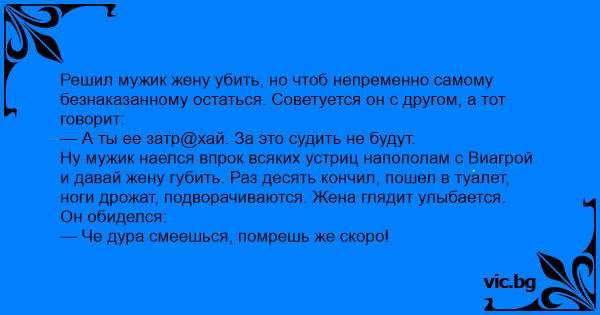 Решил мужик жену убить, но чтоб непременно самому безнаказанному остаться. Советуется он с другом, а тот говорит: — А ты ее затр@хай. За это судить не будут. Ну мужик наелся впрок всяких устриц напополам с Виагрой и давай жену губить. Раз десять кончил, пошел в туалет, ноги дрожат, подворачиваются. Жена глядит улыбается. Он обиделся: — Че дура смеешься, помрешь же скоро!