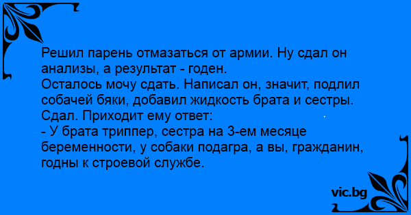Решил парень отмазаться от армии. Ну сдал он анализы, а результат - годен.