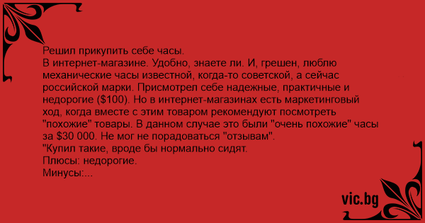 В интернет-магазине. Удобно, знаете ли. И, грешен, люблю механические часы известной, когда-то советской, а сейчас российской марки. Присмотрел себе надежные, практичные и недорогие ($100). Но в интернет-магазинах есть маркетинговый ход, когда вместе с этим товаром рекомендуют посмотреть "похожие" товары. В данном случае это были "очень похожие" часы за $30 000. Не мог не порадоваться "отзывам".